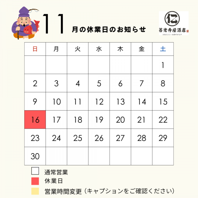 当店11月の休業日です。