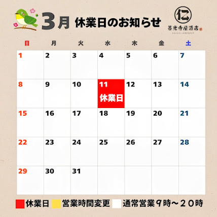当店3月の休業日です。
