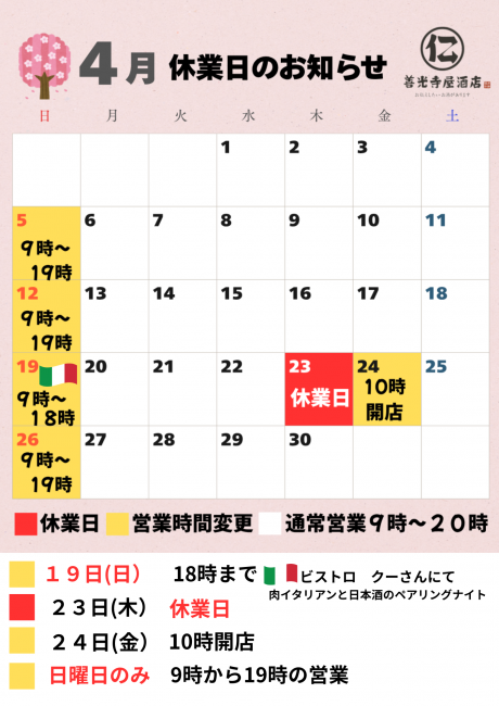 当店4月の休業日のお知らせです。
